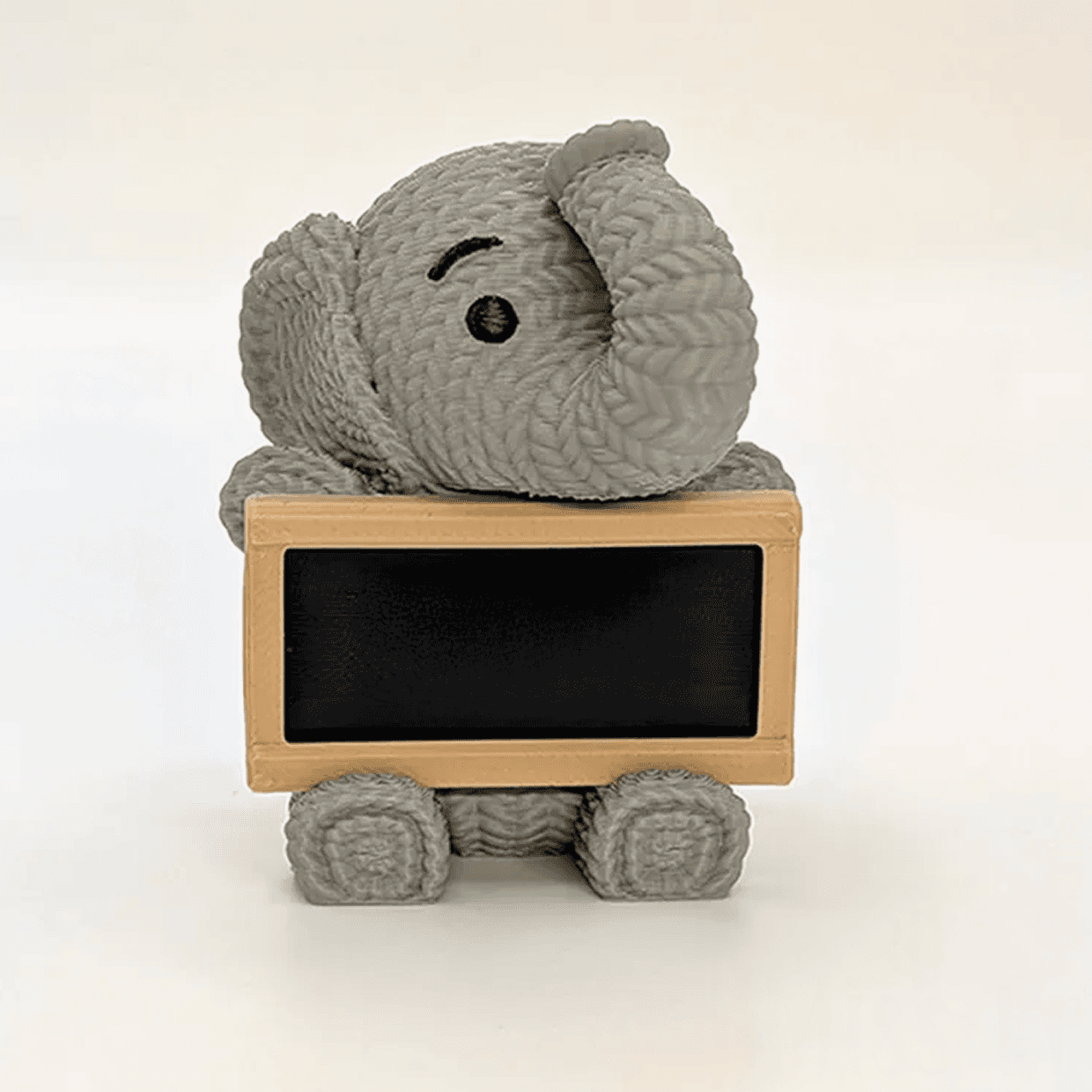 This adorable elephant figurine is 3D printed using premium PLA with a specialized printing technique that mimics knitted fabric texture. Every surface appears to be made of tiny stitches - the characteristic loops and ridges of knit work rendered in three dimensions. The result is a visual and tactile experience that evokes the cozy, comforting feeling of handmade plush toys while being surprisingly sturdy and long-lasting.