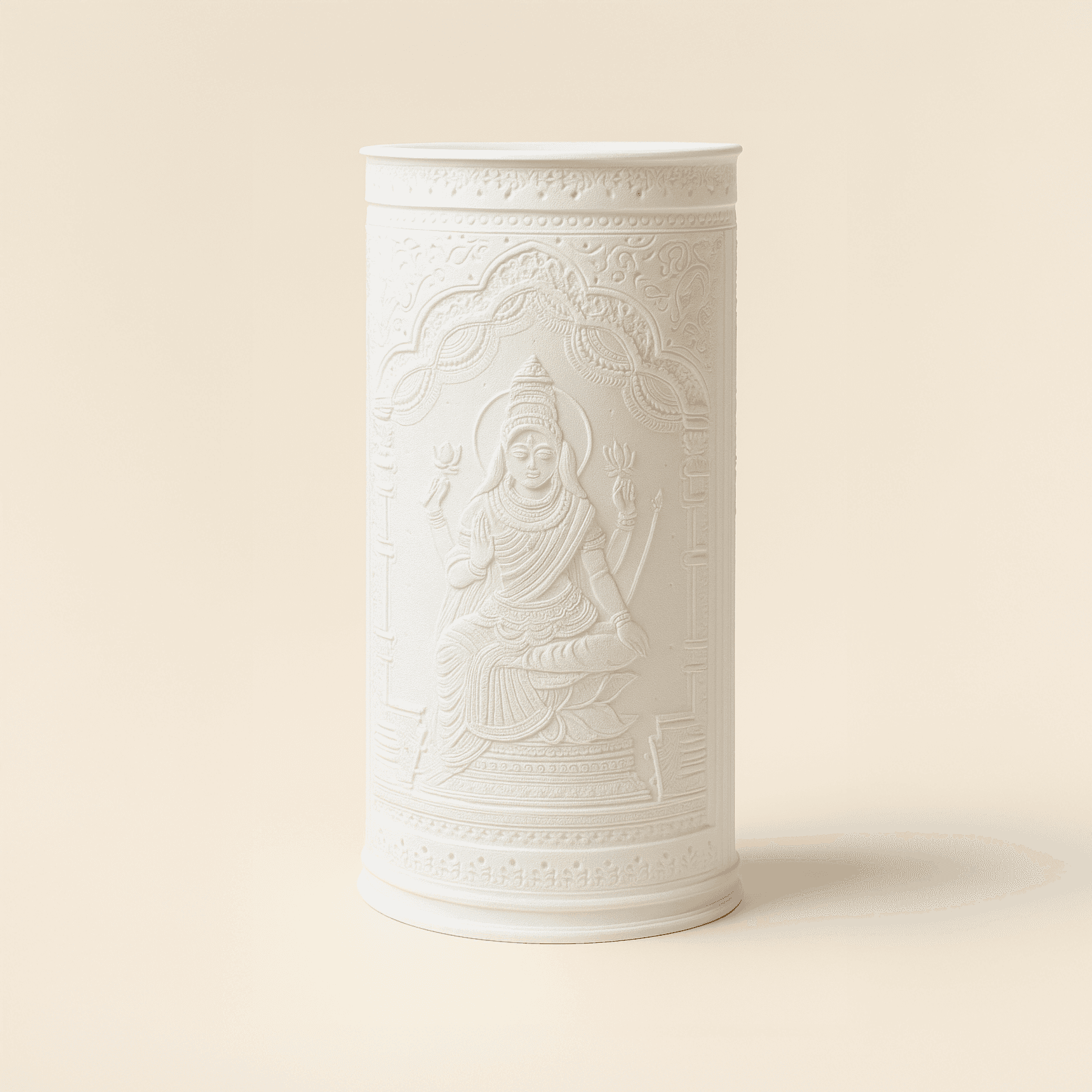 Created through precision 3D printing, this circular lamp captures Goddess Lakshmi in her most beloved iconographic form — seated in full bloom upon the lotus (padma), symbolizing purity, beauty, and spiritual power rising from muddy waters of material existence. Her four hands represent the four goals of human life: dharma (righteous living), artha (material prosperity), kama (desires fulfilled), and moksha (spiritual liberation). Gold coins flow from her hands, representing not just money but all forms of abundance. The calm expression on her face embodies the peace that true prosperity brings — not the anxious striving of scarcity consciousness, but the graceful confidence of one who dwells in abundance.